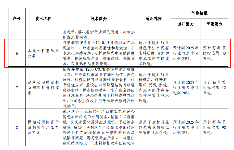 湖南昌迪此次申報的水泥生料助磨劑技術(shù)原理是改善生料易磨性和易燒性,在水泥生料粉磨、分解和燒成中可以助磨節(jié)電、提高磨窯質(zhì)量、降低排放、改善熟料品質(zhì)等作用。該技術(shù)適用于建材行業(yè)新型干法水泥窯生料粉磨、分解和燒成工序的節(jié)能技術(shù)改造。節(jié)能效果預(yù)計到2025年行業(yè)普及率可達25%,每年節(jié)約標準煤43萬噸。
