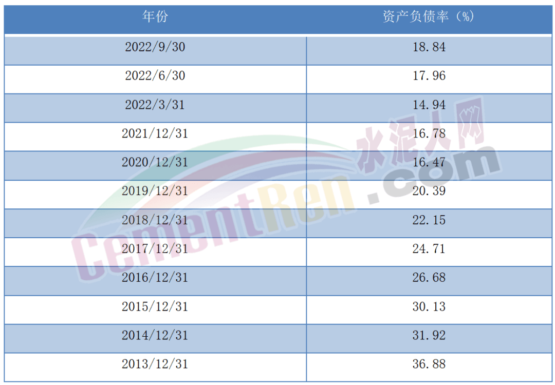 從企業(yè)資產(chǎn)負債率來看,從2013年開始海螺水泥的資產(chǎn)負債率逐年下降,2022年第三季度僅為18.84%,作為一個重資產(chǎn)的水泥企業(yè),市值過千億,這么低的負債實屬不易。
