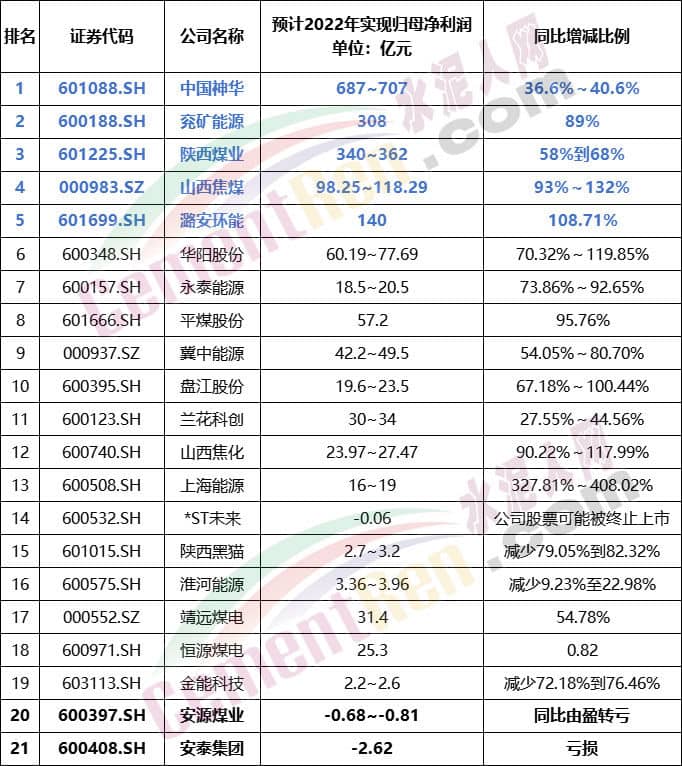 據上市公司數據顯示,截至1月30日晚間,共有21家煤炭上市企業(yè)披露2022年度業(yè)績預告,其中有中國神華、陜西煤業(yè)、兗礦能源、潞安環(huán)能、山西焦煤5家上市煤企預計2022年度凈賺上百億元,僅安源煤業(yè)、安泰集團兩家上市煤企預計凈利潤虧損。