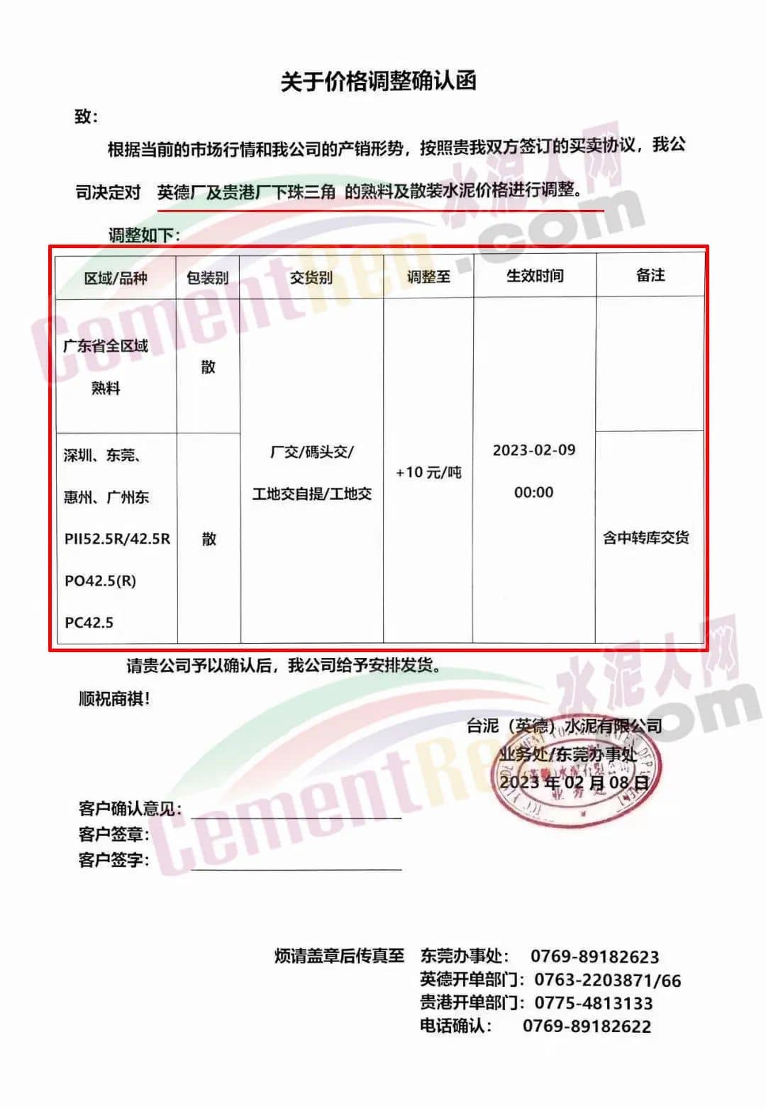 臺(tái)泥(英德)水泥有限公司通知稱(chēng),根據(jù)當(dāng)前的市場(chǎng)行情和公司的產(chǎn)銷(xiāo)形勢(shì),公司決定對(duì)英德廠及貴港廠下珠三角的熟料及散裝水泥價(jià)格進(jìn)行調(diào)整。其中針對(duì)廣東省全區(qū)域熟料價(jià)格自2月9日0時(shí)起上調(diào)10元/噸;深圳、東莞、惠州、廣州東各標(biāo)號(hào)散裝水泥上調(diào)10元/噸,散裝水泥中轉(zhuǎn)庫(kù)交貨同步上調(diào)。