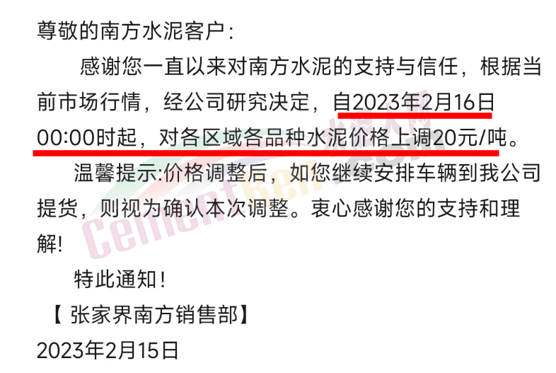 張家界南方銷售部通知,自2023年2月16日0時起,對各區(qū)域各品種水泥價格上調(diào)20元/噸。