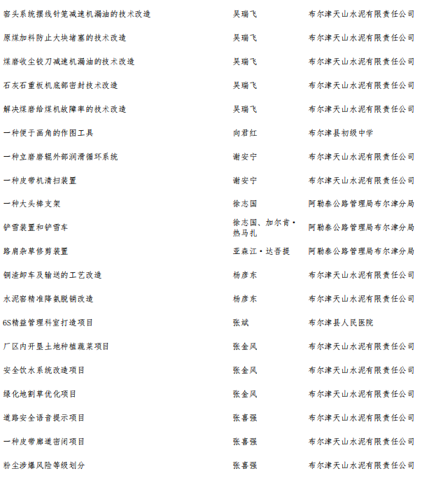 2023年布爾津天山水泥有限責(zé)任公司深入開展以“五小”創(chuàng)新活動(dòng),有效激活了員工的原動(dòng)力,強(qiáng)力助推了創(chuàng)優(yōu)建設(shè)。獲得維吾爾自治區(qū)總工會(huì)“五小”優(yōu)秀創(chuàng)新成果49項(xiàng),獲得維吾爾自治區(qū)總工會(huì)“五小”示范性優(yōu)秀創(chuàng)新成果1項(xiàng)。