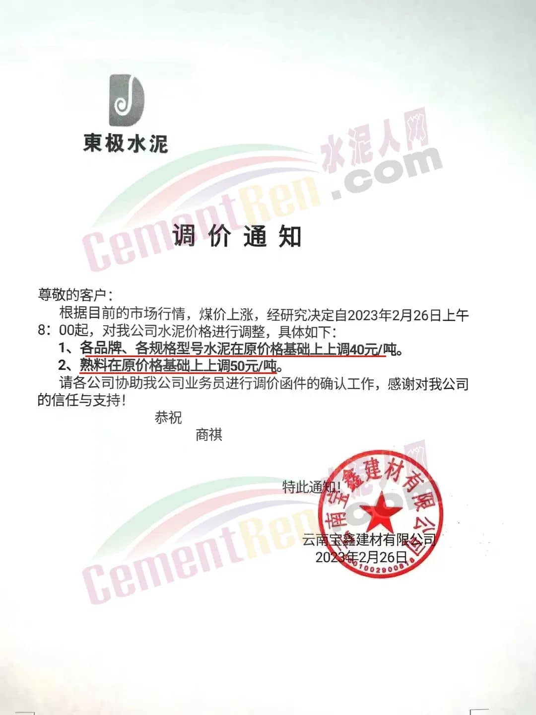 宜良縣永興水泥有限公司銷售科通知,由于原材料價格上漲,生產(chǎn)成本增加,經(jīng)公司研究決定從2023年2月26日7時起32.5型號水泥上調(diào)40元/噸。