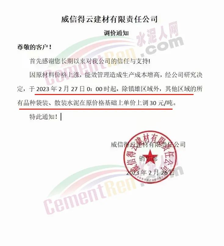 威信得云建材有限責(zé)任公司通知,因原材料價格上漲,能效管理造成生產(chǎn)成本增高,經(jīng)公司研究決定,于2023年2月27日0時起,除鎮(zhèn)雄區(qū)域外,其他區(qū)域的所有品種袋裝、散裝水泥在原價格基礎(chǔ)上上調(diào)30元/噸。