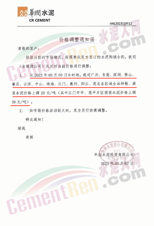 華潤(rùn)水泥通知,從3月3日0時(shí)起,公司廣州、東莞、深圳、佛山肇慶、云浮、中山、珠海、江門、惠州、陽(yáng)江、茂名各區(qū)域全品種散裝、袋裝水泥價(jià)格上調(diào)20元/噸,其中江門開(kāi)平、恩平片區(qū)袋裝水泥價(jià)格上調(diào)30元/噸。