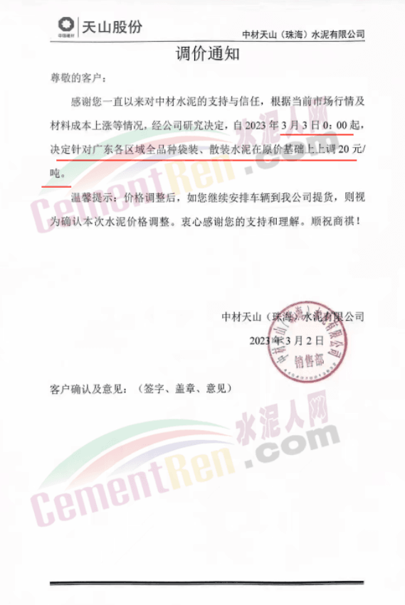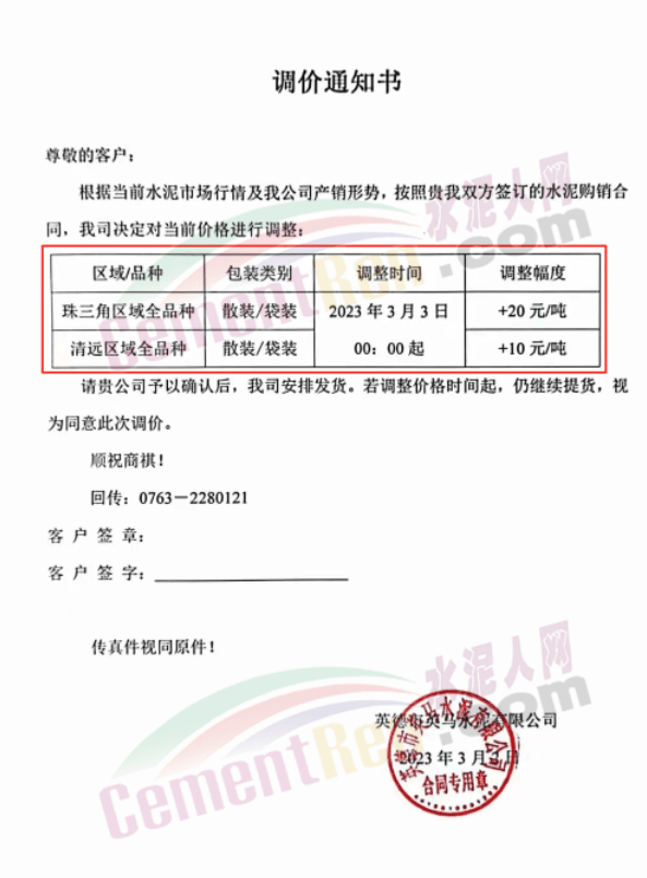 天山股份中材亨達(dá)水泥有限公司通知,根據(jù)當(dāng)前市場(chǎng)行情及材料成本上漲等情況,經(jīng)公司研究決定,自3月3日0時(shí)起決定針對(duì)廣東各區(qū)域全品種袋裝、散裝水泥在原價(jià)基礎(chǔ)上上調(diào)20元/噸。