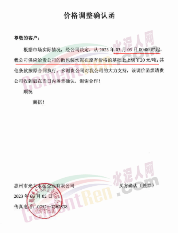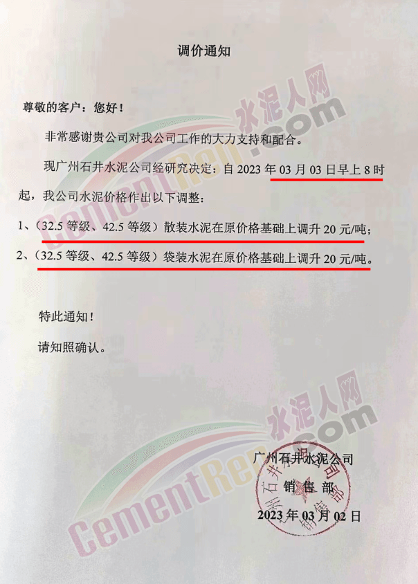 東莞市國(guó)鉅建材有限公司通知,根據(jù)市場(chǎng)行情及各種原材料價(jià)格持續(xù)上漲,經(jīng)公司研究決定從2023年3月4日早上8時(shí)起,公司生產(chǎn)的所有品種水泥在原有價(jià)格的基礎(chǔ)上上調(diào)20元/噸。