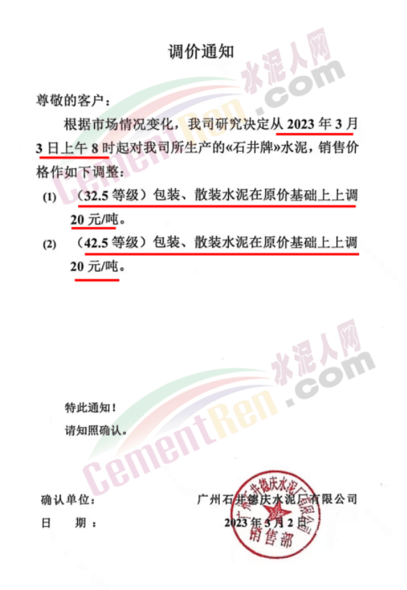 廣州石井水泥、石井德慶水泥通知,自3月3日早上8時(shí)起,公司各標(biāo)號(hào)水泥上調(diào)20元/噸。