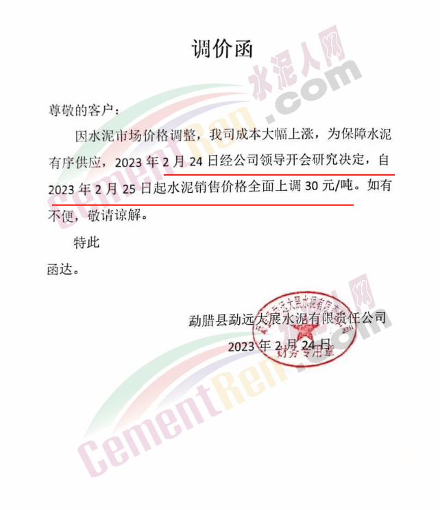 勐臘縣勐遠(yuǎn)大展水泥有限責(zé)任公司通知,水泥市場(chǎng)價(jià)格調(diào)整,公司成本大幅上漲,為保障水泥有序供應(yīng),經(jīng)公司領(lǐng)導(dǎo)開(kāi)會(huì)研究決定,自2023年2月25日起水泥銷售價(jià)格全面上調(diào)30元/噸。