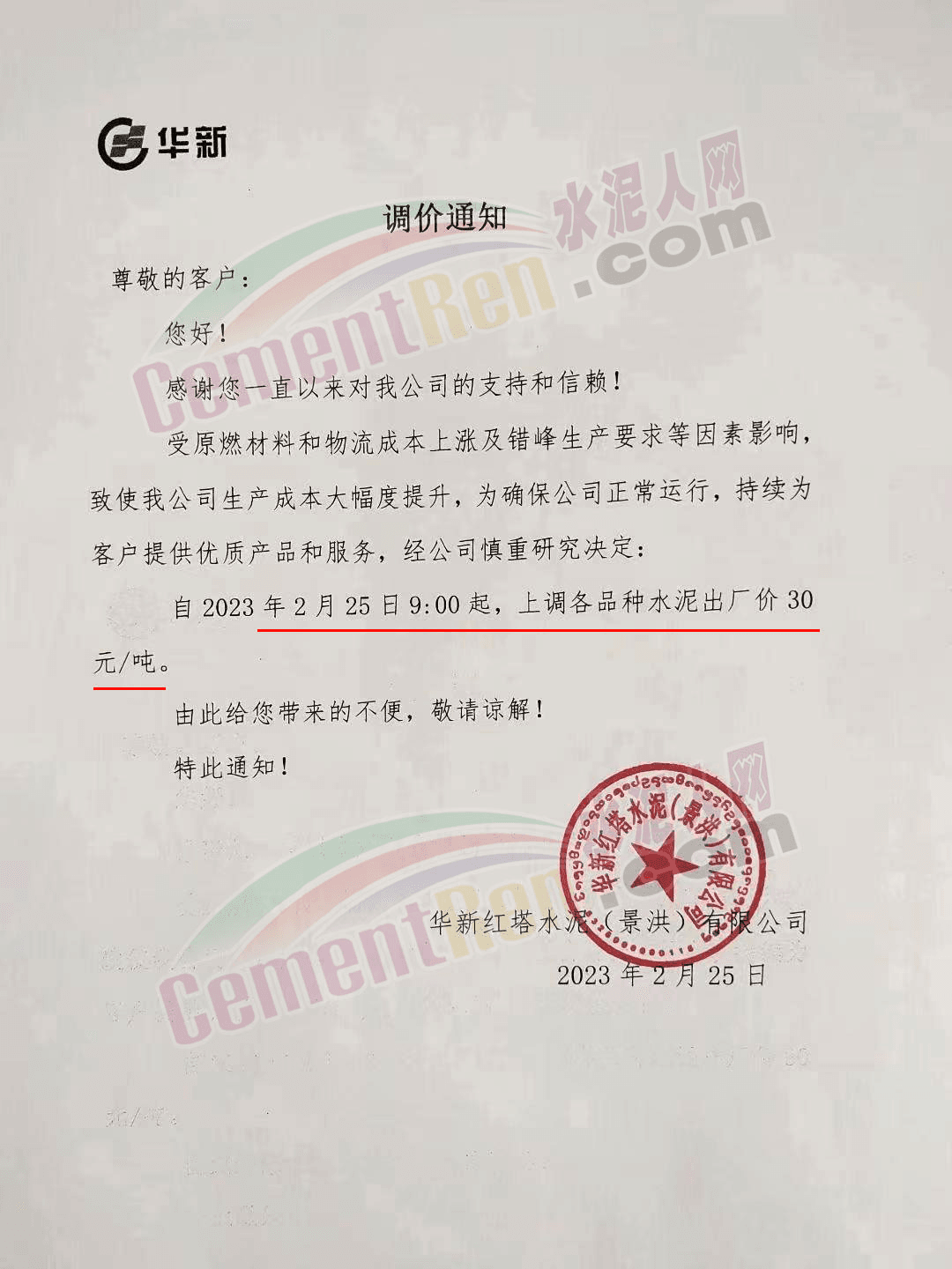 華新紅塔水泥通知,受原燃材料和物流成本上漲及錯(cuò)峰生產(chǎn)要求等因素影響,致使公司生產(chǎn)成本大幅度提升,為確保公司正常運(yùn)行,持續(xù)為客戶提供優(yōu)質(zhì)產(chǎn)品和服務(wù),經(jīng)公司慎重研究決定自2023年2月25日9時(shí)起,上調(diào)各品種水泥出廠價(jià)30元/噸。