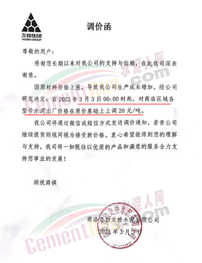 宜良縣永興水泥有限公司銷售科通知,由于原材料價(jià)格上漲,生產(chǎn)成本增加,經(jīng)公司研究決定從2023年2月26日7時(shí)起32.5型號(hào)水泥上調(diào)40元/噸。
