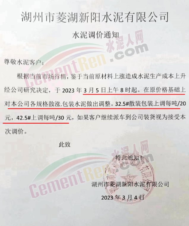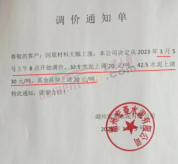 湖州高翔水泥有限公司通知,由于原材料漲價(jià),導(dǎo)致公司生產(chǎn)成本的不斷上升,本著互惠互利的原則,現(xiàn)經(jīng)公司研究決定,于2023年3月5日8時(shí)起,將對(duì)本公司生產(chǎn)的42.5(包裝)水泥在原來(lái)價(jià)格的基礎(chǔ)上上漲 30元/噸,325(包裝)水泥在原來(lái)價(jià)格的基礎(chǔ)上上漲20元/噸。