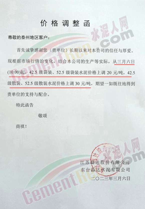 江蘇磊達(dá)股份有限公司通知泰州地區(qū)客戶稱,根據(jù)市場行情的變化,結(jié)合本公司的生產(chǎn)等實際,從3月6日10時起,42.5級袋裝、52.5級袋裝水泥價格上調(diào)20元/噸,425級散裝、52.5級散裝水泥價格上調(diào)30元/噸。