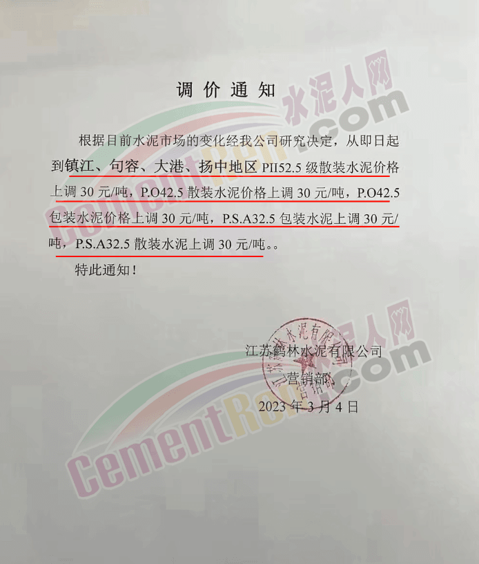 3月4日,江蘇鶴林水泥有限公司通知,對鎮(zhèn)江、句容、大港、揚中地區(qū)各標(biāo)號水泥上調(diào)30元/噸。