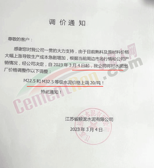 江蘇省鯨龍水泥有限公司通知,由于目前熟料及原材料價格大幅上漲導(dǎo)致生產(chǎn)成本急劇增加,根據(jù)當(dāng)前周邊市場行情和公司產(chǎn)銷情況,經(jīng)公司決定,自2023年3月4日起對M22.5和M32.5等級水泥價格上調(diào)20元/噸。