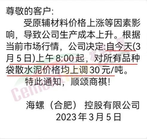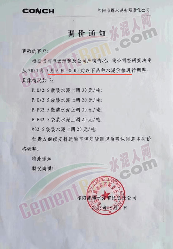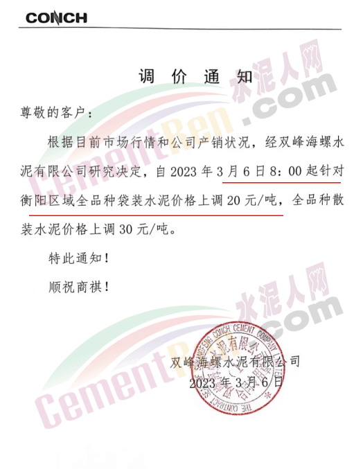 雙峰海螺水泥通知,自2023年3月6日8時起針對衡陽區(qū)域全品種袋裝水泥價格上調(diào)20元/噸,全品種散裝水泥價格上調(diào)30元/噸。