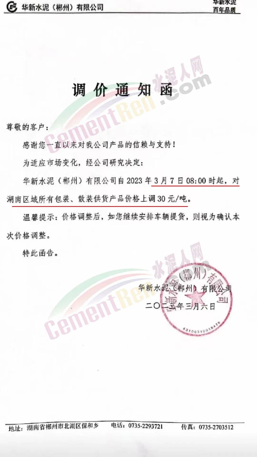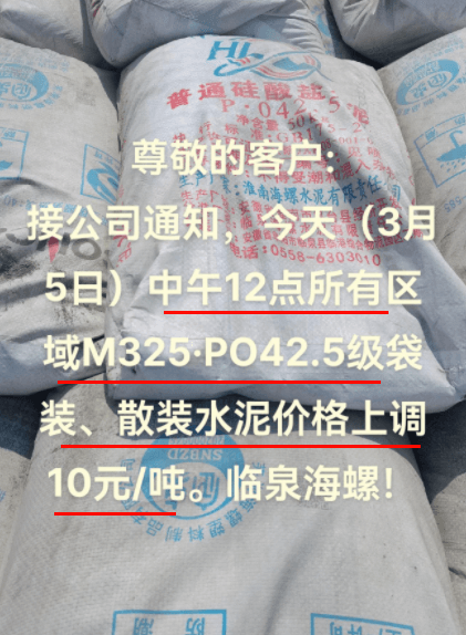 華新水泥(郴州)有限公司通知,自3月7日8時起,對湖南區(qū)域所有包裝、散裝供貨產(chǎn)品價格上調(diào)30元/噸。