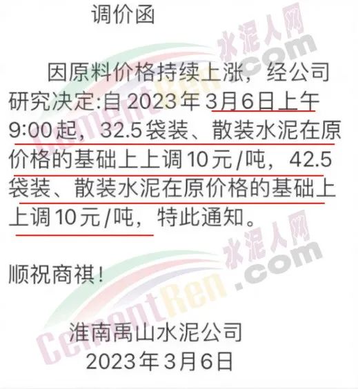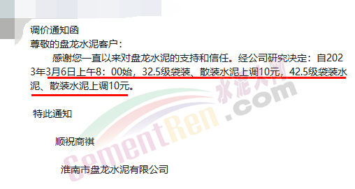 淮南市盤龍水泥、淮南禹山水泥公司、淮礦水泥廠、沿淮水泥廠通知,自3月6日起,水泥價格上調(diào)10元/噸。