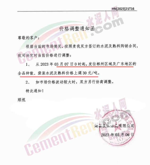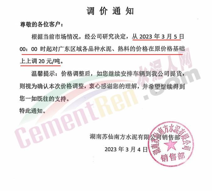 湖南蘇仙南方水泥銷售部通知,根據(jù)當(dāng)前市場情況,經(jīng)公司研究決定,從2023年3月5日0時起對廣東區(qū)域各品種水泥、熟料的價格在原價格基礎(chǔ)上上調(diào)20元/噸。