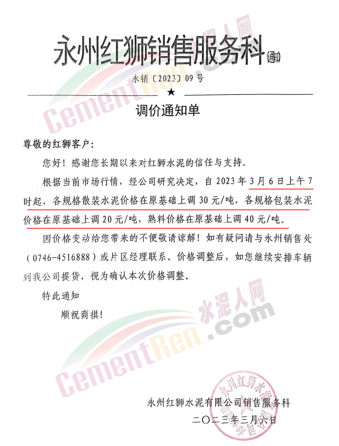 永州紅獅銷售服務(wù)科通知,根據(jù)當(dāng)前市場行情,經(jīng)公司研究決定,自2023年3月6日上午7時起,各規(guī)格散裝水泥價格在原基礎(chǔ)上調(diào)30元/噸,各規(guī)格包裝水泥價格在原基礎(chǔ)上調(diào)20元/噸,熟料價格在原基礎(chǔ)上調(diào)40元/噸。
