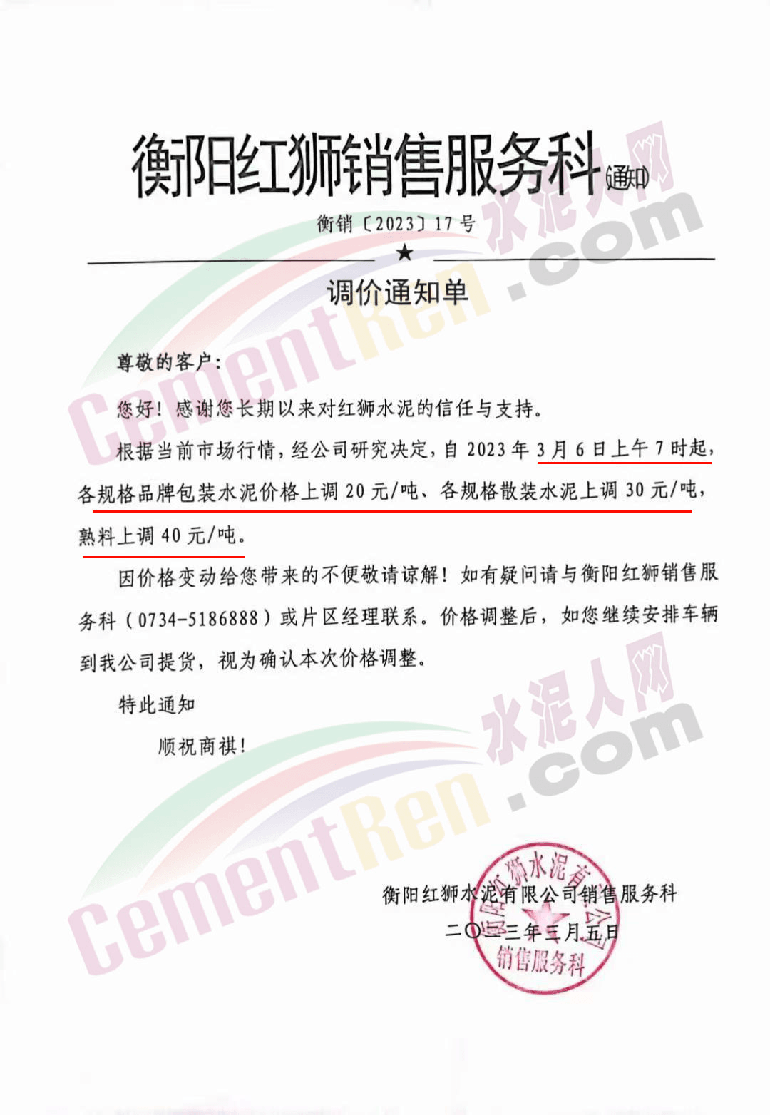 衡陽紅獅銷售服務(wù)科通知,根據(jù)當(dāng)前市場行情,經(jīng)公司研究決定,自2023年3月6日上午7時起各規(guī)格品牌包裝水泥價格上調(diào)20元/噸、各規(guī)格散裝水泥上調(diào)30元/噸,熟料上調(diào)40元/噸。