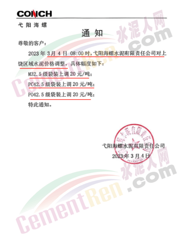江西弋陽海螺水泥通知,3月4日起對上饒區(qū)域水泥價格20元/噸。