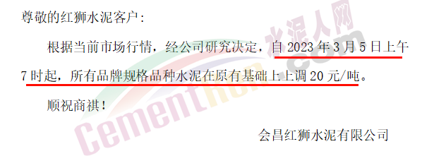 會昌紅獅水泥有限公司通知,根據(jù)當(dāng)前市場行情,經(jīng)公司研究決定,自2023年3月5日上午7時起,所有品牌規(guī)格品種水泥在原有基礎(chǔ)上上調(diào)20元/噸。