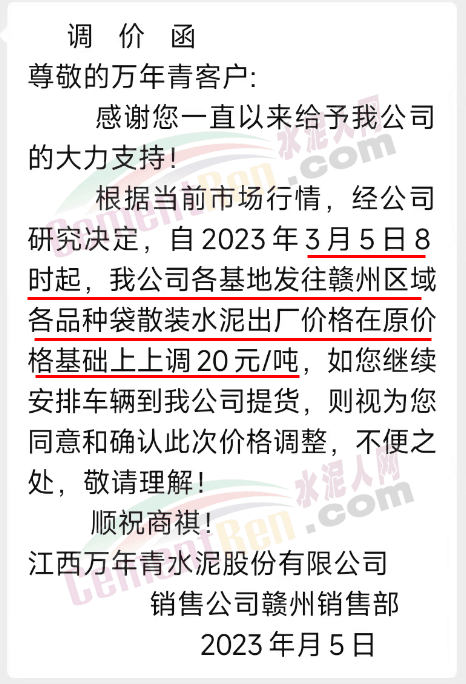 江西萬年青水泥贛州銷售部通知,根據(jù)當(dāng)前市場行情,經(jīng)公司研究決定,自2023年3月5日8時起,各基地發(fā)往贛州區(qū)域各品種袋散裝水泥出廠價格在原價格基礎(chǔ)上上調(diào)20元/噸。