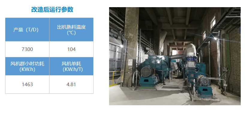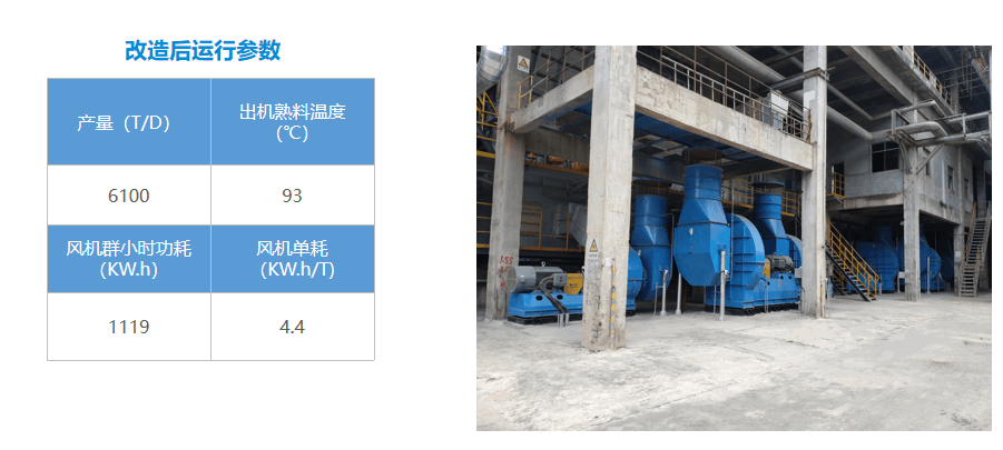 該企業(yè)隸屬于北方某大型水泥集團(tuán),目前該工廠裝備1條日產(chǎn)3200噸規(guī)模的熟料生產(chǎn)線,2022年推進(jìn)的篦冷機(jī)改造中,選用沃亞機(jī)械高效篦冷機(jī)冷卻風(fēng)機(jī),投入運(yùn)行8個(gè)月時(shí)間,通過三方技術(shù)標(biāo)定,本項(xiàng)目冷卻風(fēng)機(jī)運(yùn)行效率高(風(fēng)機(jī)群整體運(yùn)行效率>83.7%),冷卻電耗表現(xiàn)非常優(yōu)異,風(fēng)機(jī)效率優(yōu)勢(shì)明顯,達(dá)到同類篦冷機(jī)技改電耗最佳水平。