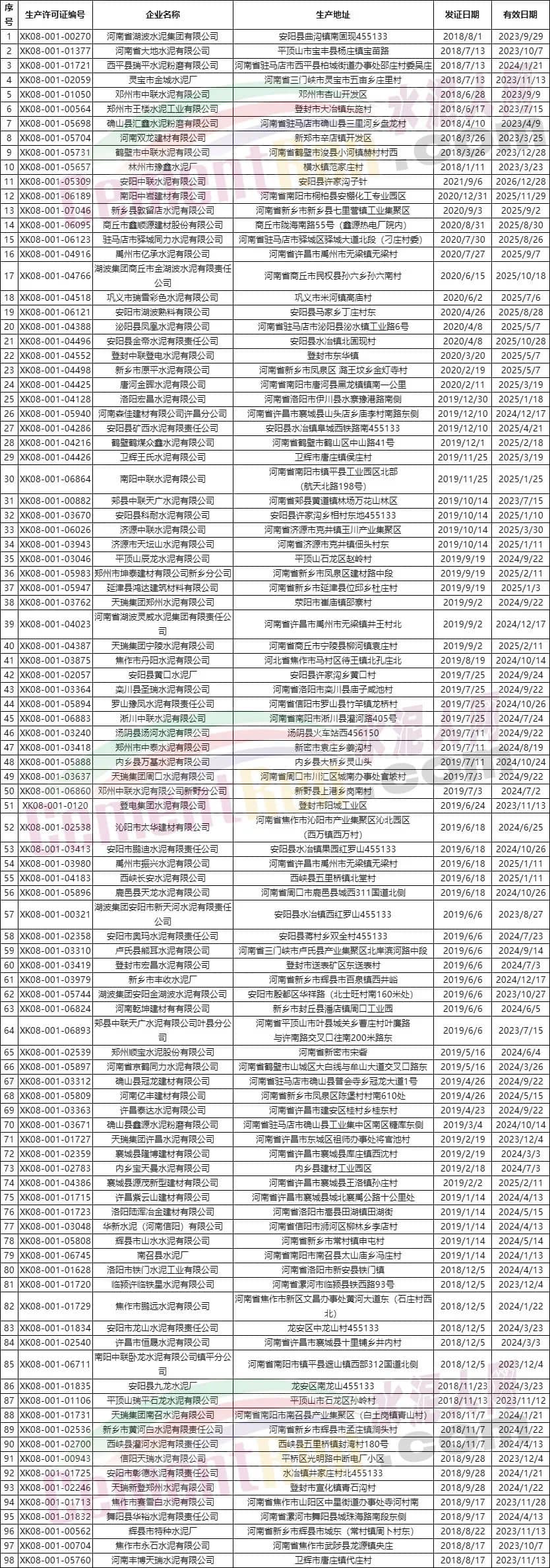 河南省210個編號水泥產品工業(yè)品生產許可證有效