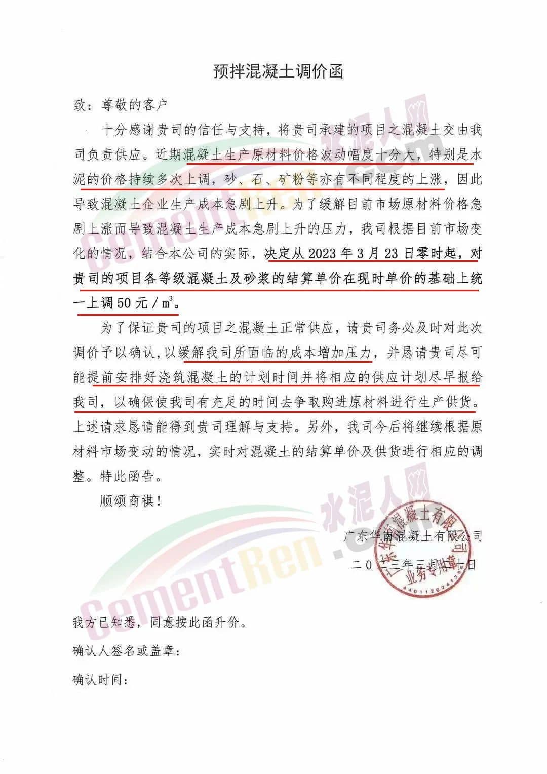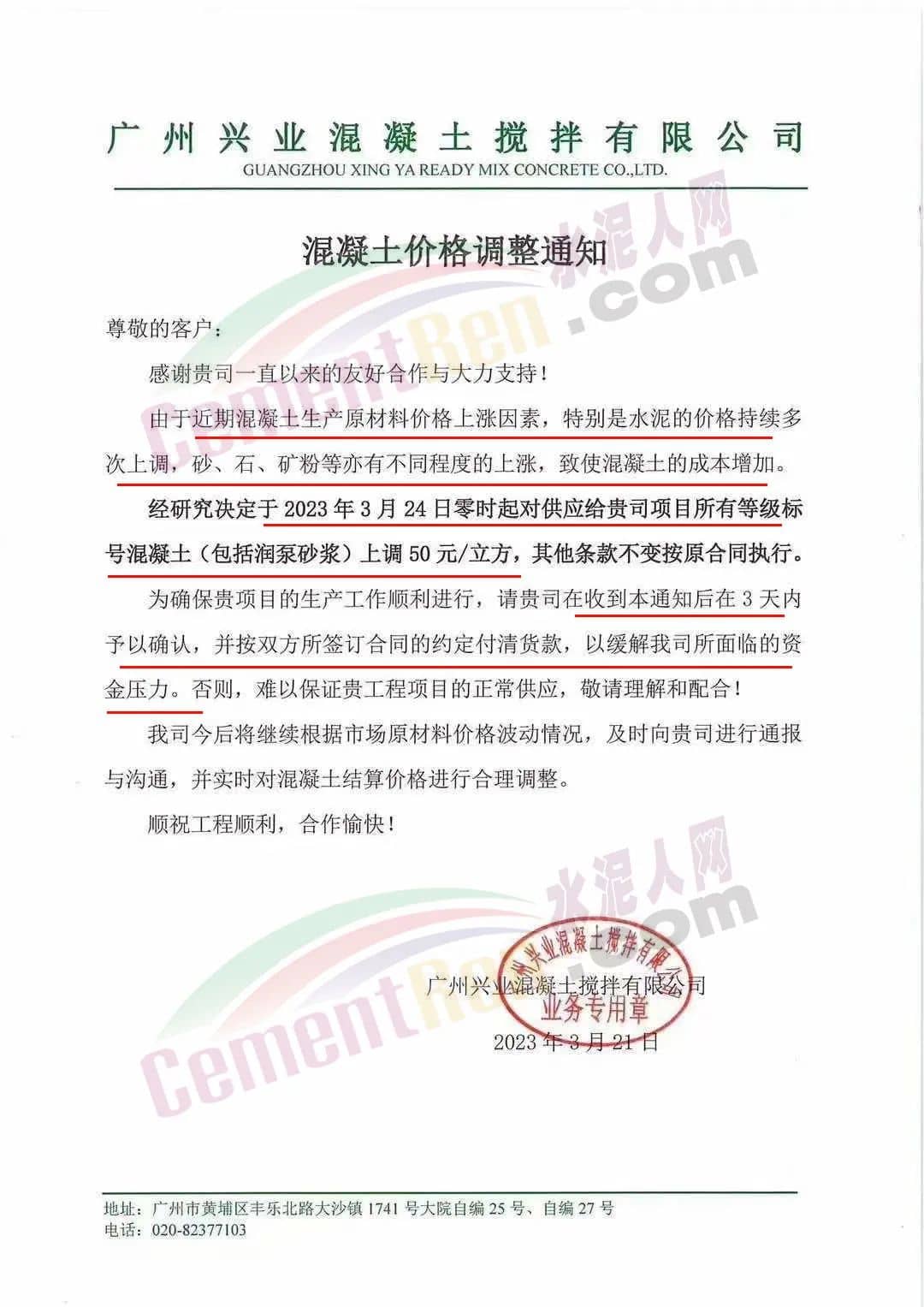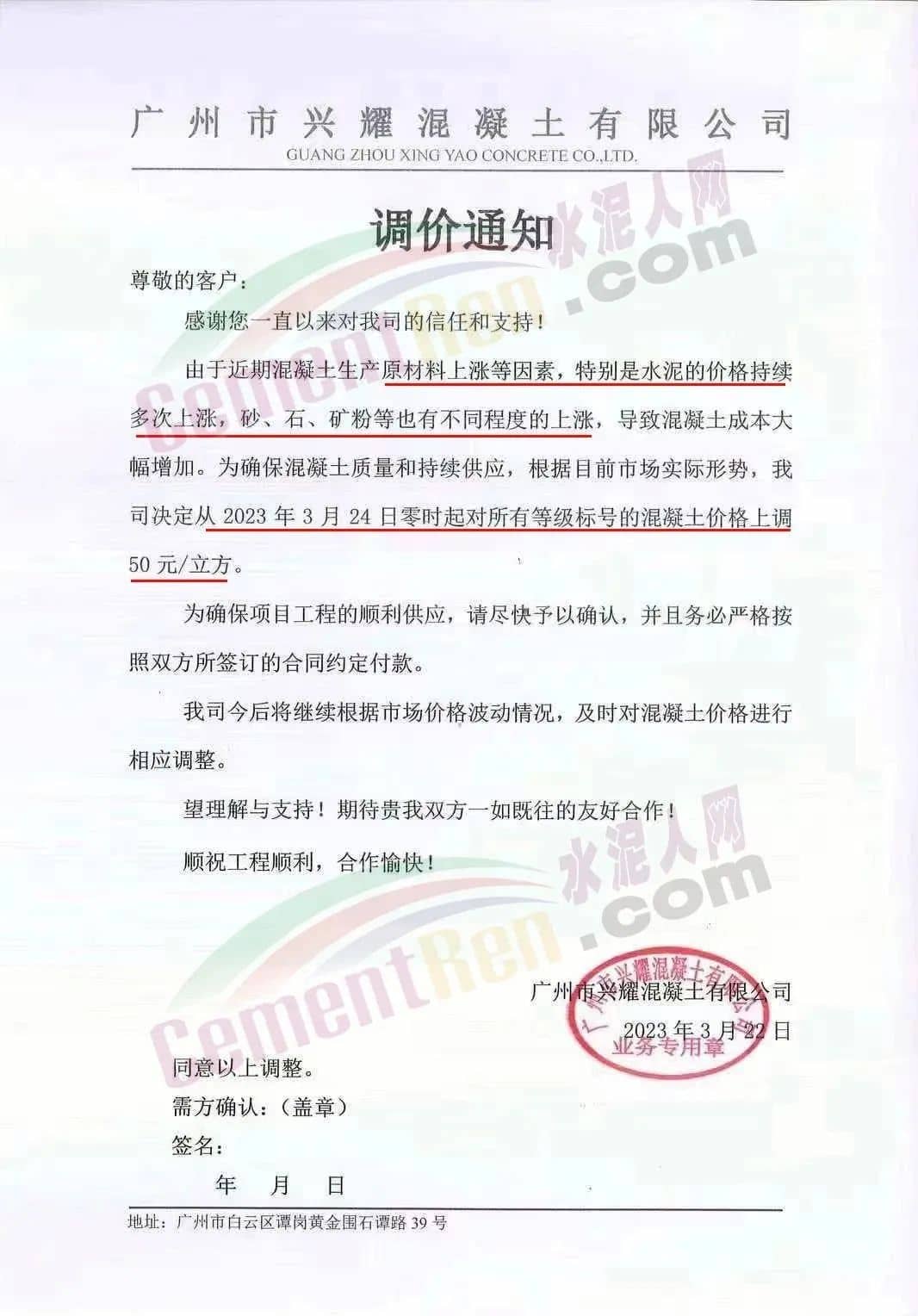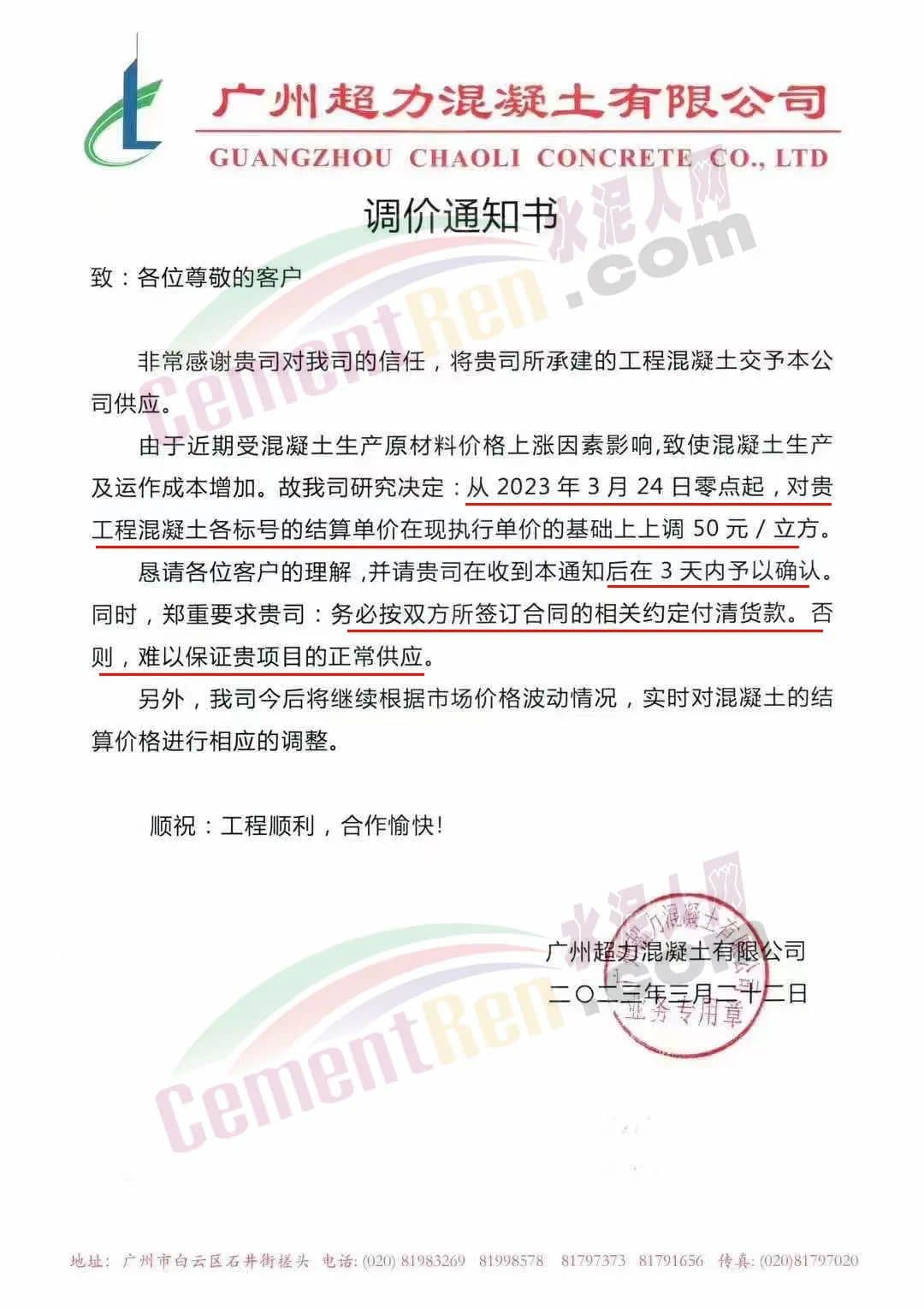 廣州興業(yè)混凝土攪拌有限公司通知由于近期混凝土生產(chǎn)原材料價(jià)格上漲因素,特別是水泥的價(jià)格持續(xù)多次上調(diào),砂、石、礦粉等亦有不同程度地上漲,致使混凝土的成本增加。經(jīng)研究決定于2023年3月24日零時(shí)起對所有等級標(biāo)號混凝土(包括潤泵砂漿)上調(diào)50元/立方,請客戶在收到通知后在3天內(nèi)予以確認(rèn),并按雙方所簽訂合同的約定付清貨款,以緩解公司所面臨的資金壓力,否則,難以保證工程項(xiàng)目的正常供應(yīng)。