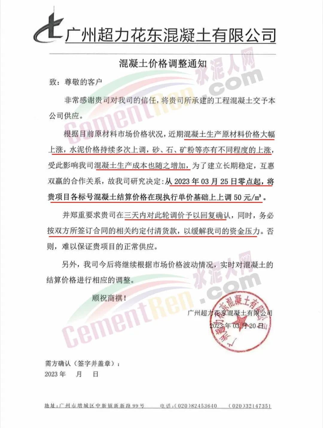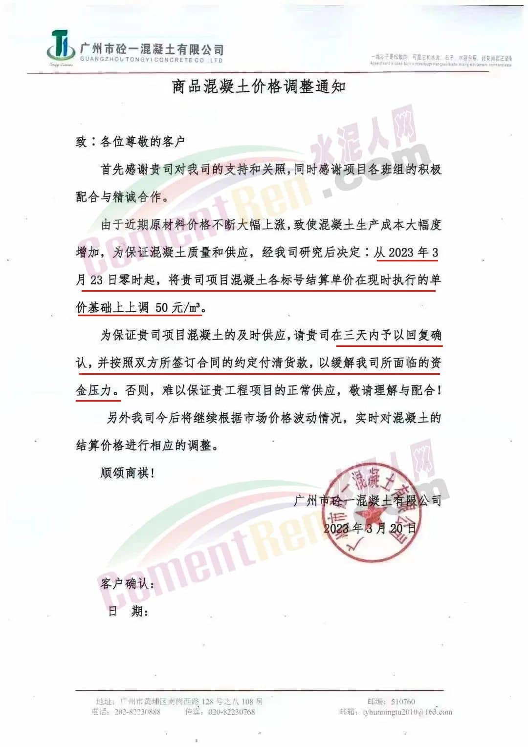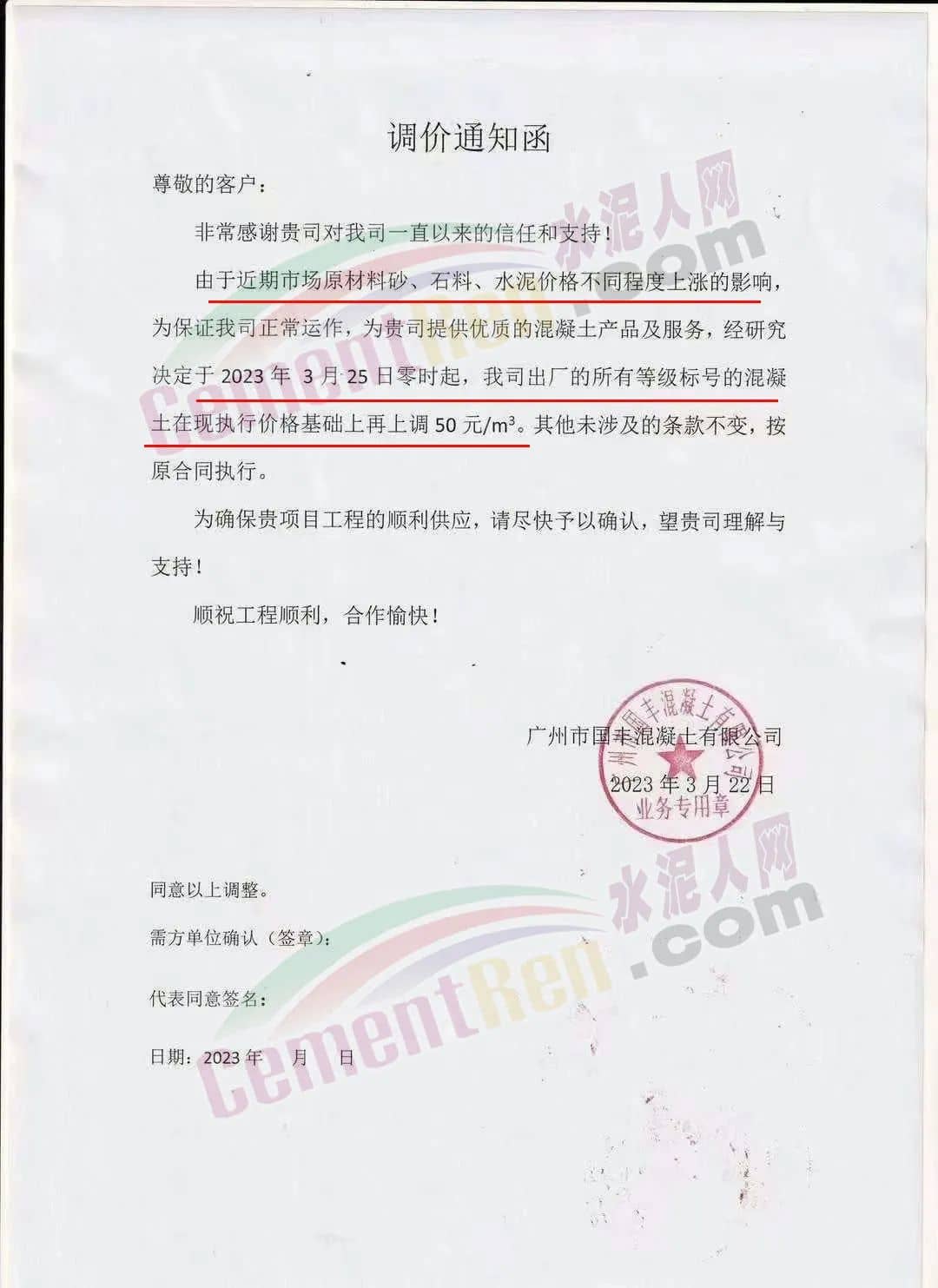 廣州市砼一混凝土有限公司通知由于近期原材料價(jià)格不斷大幅上漲,致使混凝土生產(chǎn)成本大幅度增加,為保證混凝土質(zhì)量和供應(yīng),經(jīng)公司研究后決定從2023年3月23日零時(shí)起,混凝土各標(biāo)號結(jié)算單價(jià)在現(xiàn)時(shí)執(zhí)行的單價(jià)基礎(chǔ)上上調(diào)50元/立方。為保證項(xiàng)目混凝土的及時(shí)供應(yīng),請客戶三天內(nèi)予以回復(fù)確認(rèn),并按照雙方所簽訂合同的約定付清貨款,以緩解公司所面臨的資金壓力,否則,難以保證工程項(xiàng)目的正常供應(yīng)。