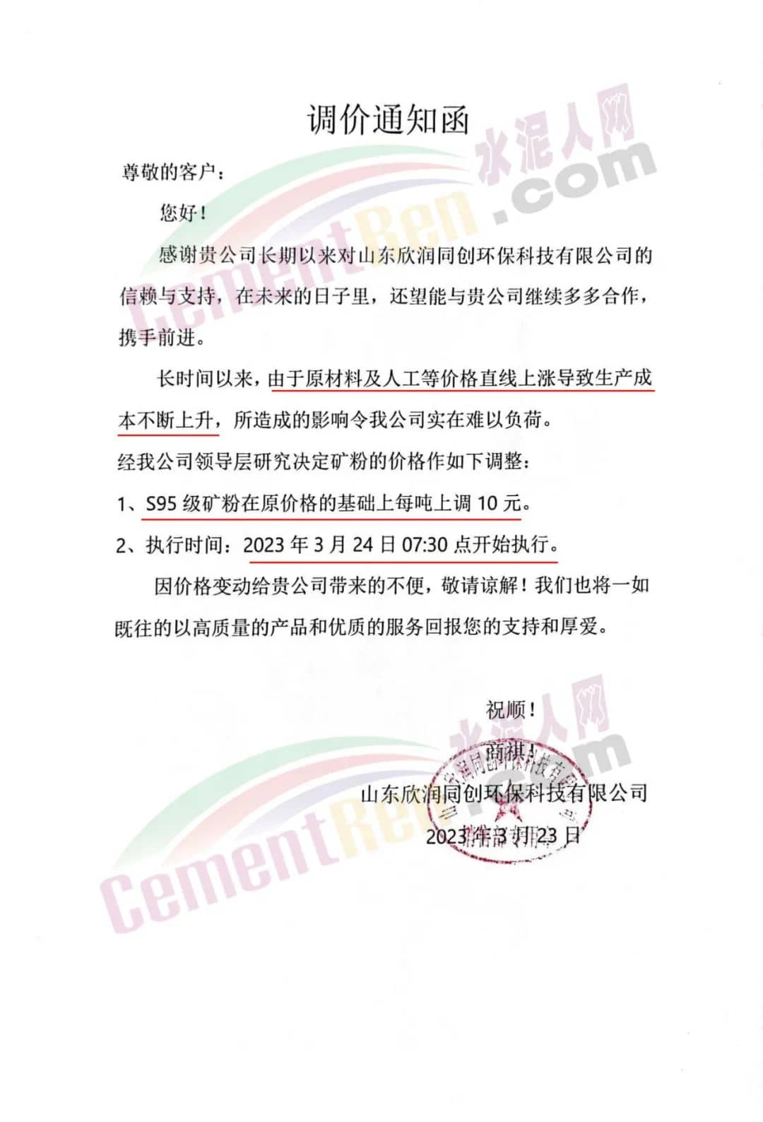 山東欣潤同創(chuàng)環(huán)??萍加邢薰就ㄖ捎谠牧霞叭斯さ葍r(jià)格直線上漲導(dǎo)致生產(chǎn)成本不斷上升,所造成的影響令公司實(shí)在難以負(fù)荷。經(jīng)公司領(lǐng)導(dǎo)層研究決定從2023年3月24日7:30點(diǎn)開始S95級礦粉在原價(jià)格的基礎(chǔ)上每噸上調(diào)10元。
