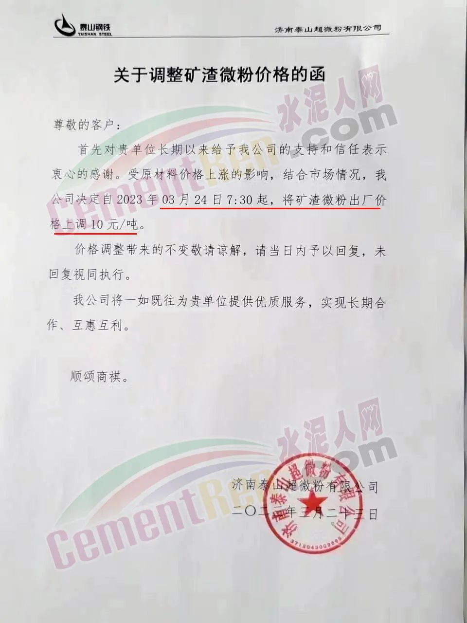 濟(jì)南泰山超微粉有限公司關(guān)于調(diào)整礦渣微粉價(jià)格的函稱,受原材料價(jià)格上漲的影響,結(jié)合市場情況,公司決定自2023年03月24日7:30起,將礦渣微粉出廠價(jià)格上調(diào)10元/噸。