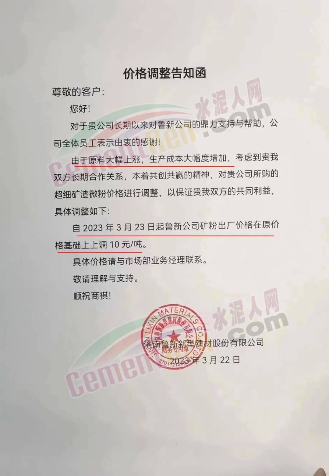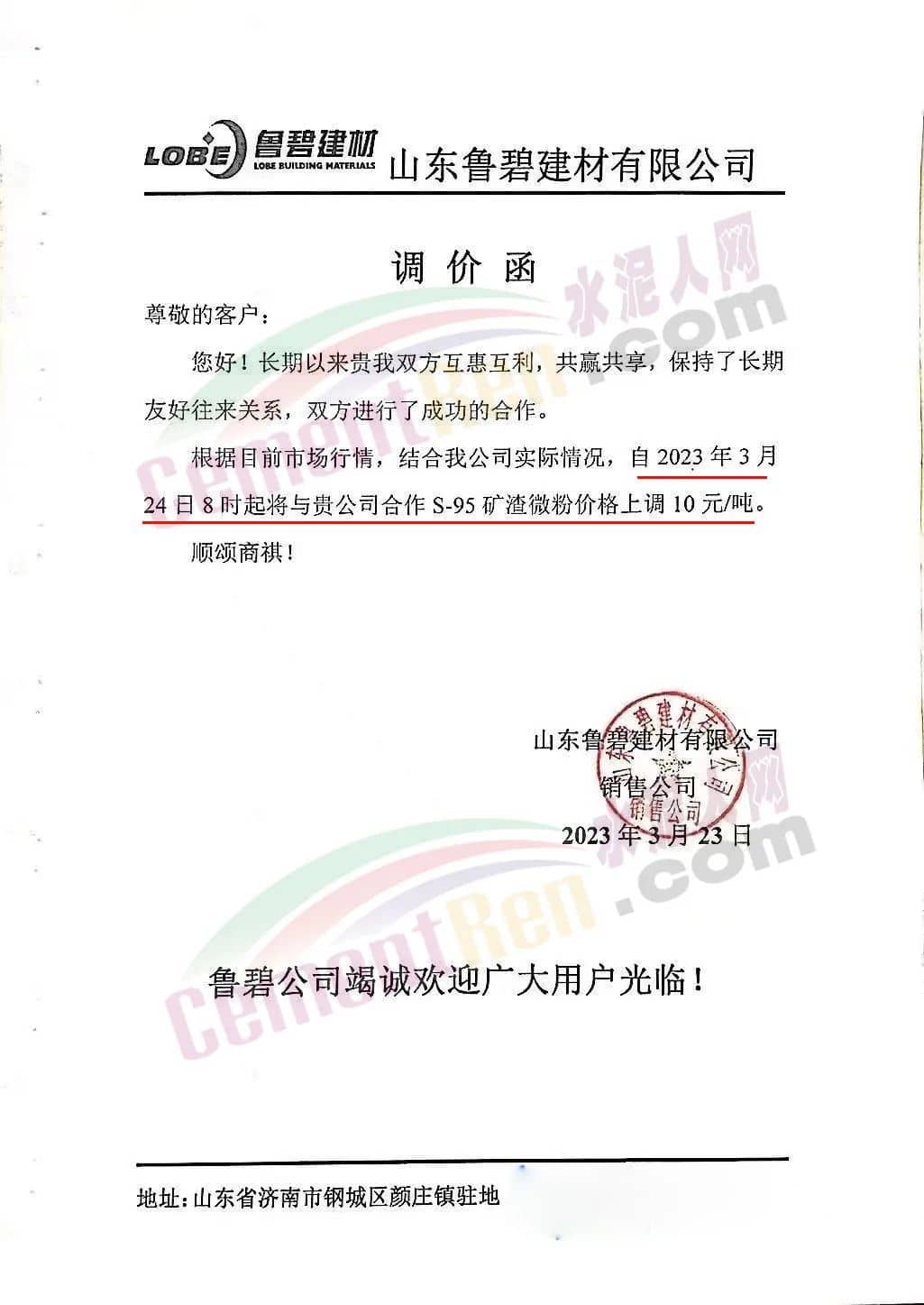 山東魯碧建材有限公司通知自2023年3月24日8時(shí)起將與貴公司合作S95礦渣微粉價(jià)格上調(diào)10元/噸。