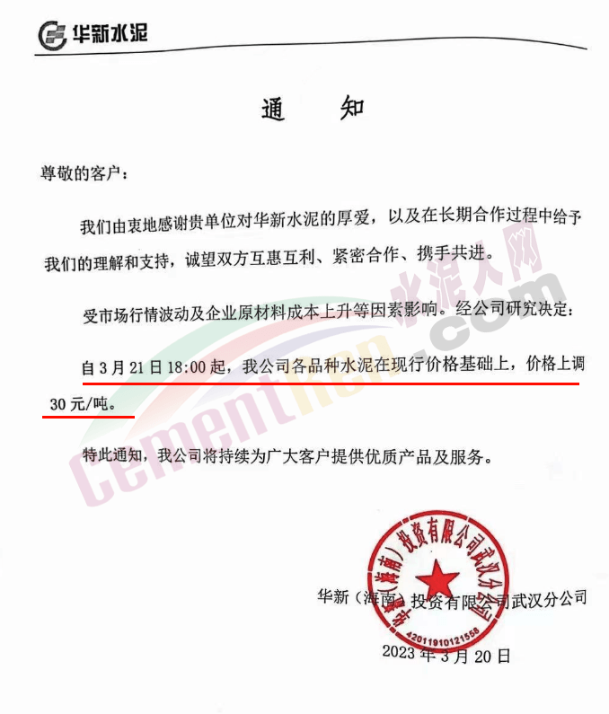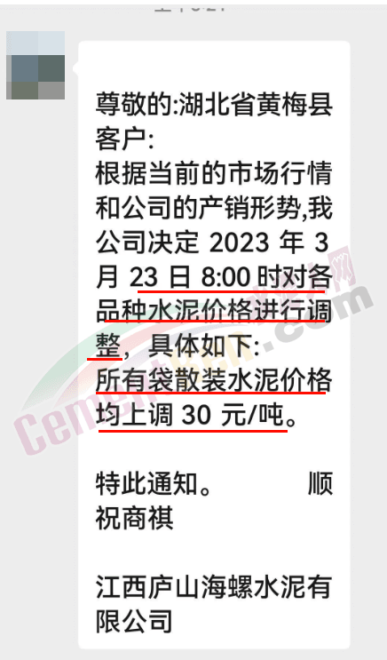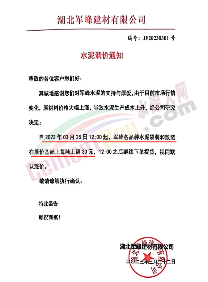 湖北軍峰建材有限公司通知,由于目前市場行情變化,原材料價(jià)格大幅上漲,導(dǎo)致水泥生產(chǎn)成本上升,經(jīng)公司研究決定自2023年3月25日12:00起,軍峰各品種水泥袋裝和散裝在原價(jià)基礎(chǔ)上每噸上調(diào)30元。