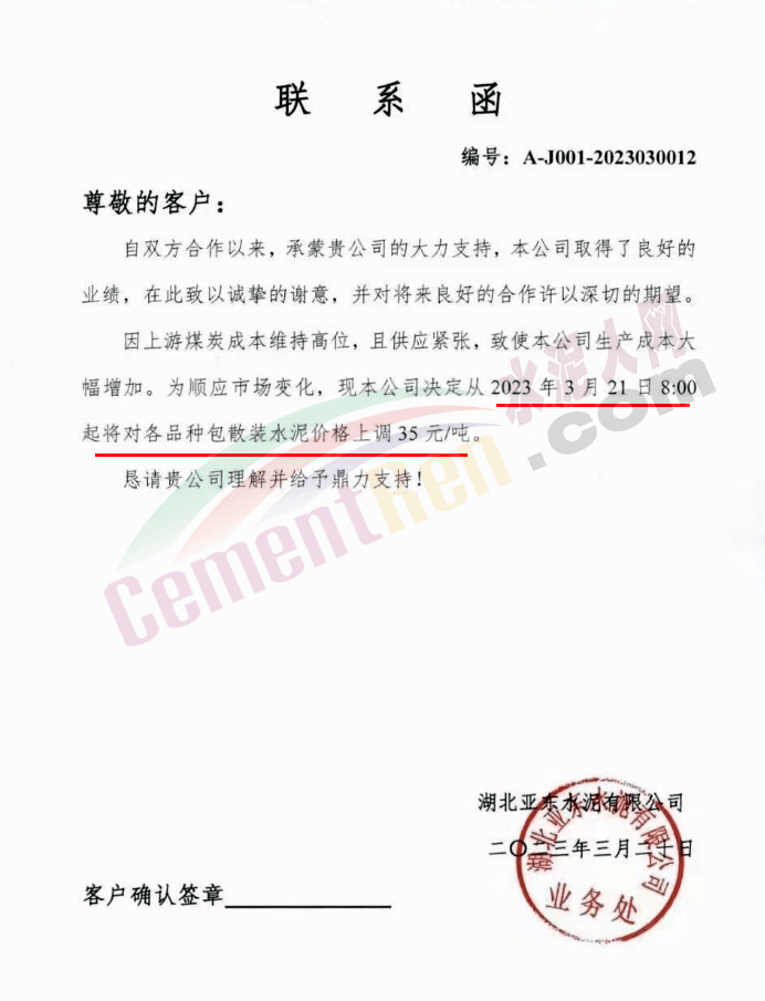 湖北亞東水泥有限公司通知,因上游煤炭成本維持高位,且供應(yīng)緊張,致使本公司生產(chǎn)成本大幅增加。為順應(yīng)市場變化,現(xiàn)本公司決定從2023年3月21日8:00起將對各品種包散裝水泥價(jià)格上調(diào)35元/噸。