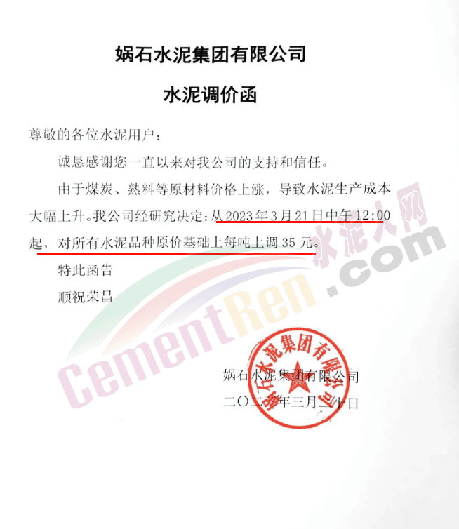 媧石水泥集團(tuán)有限公司通知,由于煤炭、熟料等原材料價(jià)格上漲,導(dǎo)致水泥生產(chǎn)成本大幅上升。公司經(jīng)研究決定從2023年3月21日中午12:00起,對所有水泥品種原價(jià)基礎(chǔ)上每噸上調(diào)35元。