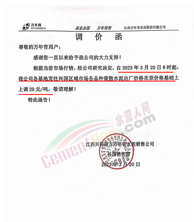 江西興國南方萬年青水泥銷售公司通知自2023年3月20日8時(shí)起公司各基地發(fā)往興國區(qū)域市場各品種袋散水泥出廠價(jià)格在原價(jià)格基礎(chǔ)上上調(diào)20元/噸。