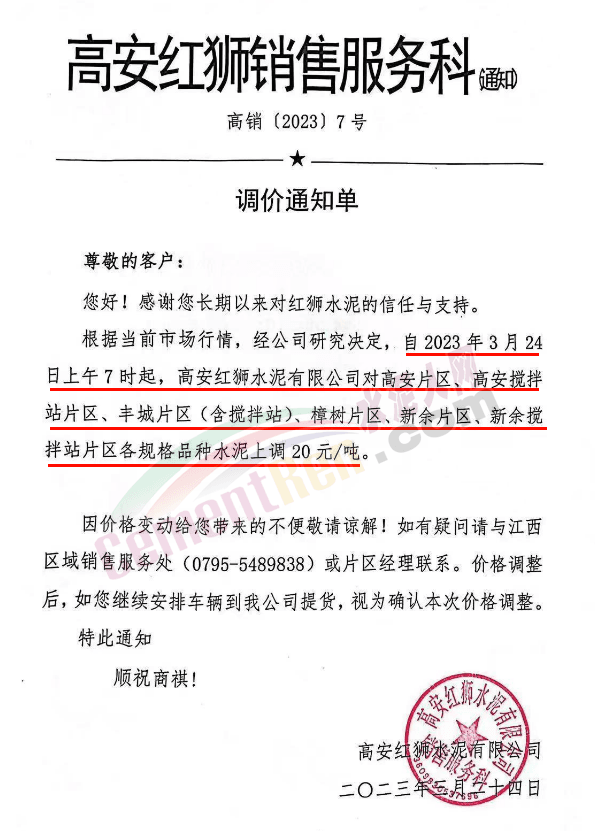 高安紅獅銷售服務(wù)科通知自2023年3月24日上午7時(shí)起,對高安片區(qū)、高安攪拌站片區(qū)、豐城片區(qū)(含攪拌站)、樟樹片區(qū)、新余片區(qū)、新余攪拌站片區(qū)各規(guī)格品種水泥上調(diào)20元/噸。