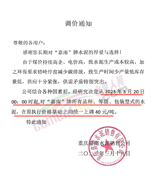 重慶嘉南水泥銷售公司通知,由于煤價(jià)持續(xù)高企、電價(jià)高,致水泥生產(chǎn)成本較高,加之環(huán)保要求錯(cuò)峰停窯減少碳排放,致生產(chǎn)時(shí)間少產(chǎn)量低庫存量低,供應(yīng)十分緊張,供需矛盾特別突出。公司綜合各種因素后,經(jīng)研究決定從2023年3月20日0時(shí)起,對“嘉南”牌所有品種、等級、包裝型式的水泥,在原執(zhí)行價(jià)格基礎(chǔ)上均統(tǒng)一上調(diào)40元/噸。