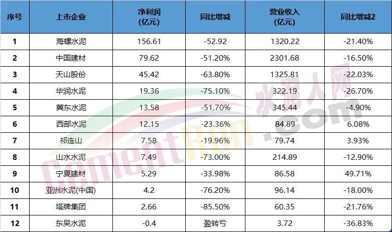 近期12家水泥上市公司先后發(fā)布了2022年度業(yè)績報告,其中包括海螺水泥、冀東水泥、華潤水泥在內的9家水泥上市公司呈現(xiàn)營收、利潤額雙下滑的情況,西部水泥、祁連山、寧夏建材3家上市公司出現(xiàn)增收不增利的情況。