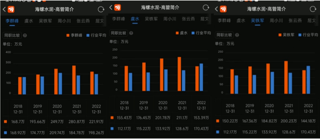 從海螺水泥2022年度報告數(shù)據(jù)可見,2022年度海螺水泥營業(yè)收入和凈利潤雙雙下滑,截至2022年12月31海螺水泥上市公司14位高管中已公布薪酬的9位高管薪酬合計約1068萬元。包括總經(jīng)理李群峰、副總經(jīng)理虞水、吳鐵軍等在內的多位高管2022年薪酬較2021年有所減少。其中,李群峰降薪58.97萬元,虞水降薪57.71萬元,吳鐵軍降薪56.05萬元。