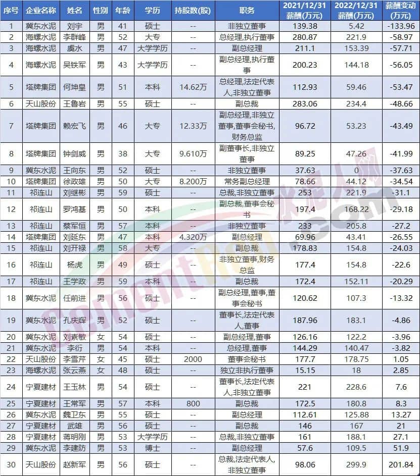 企業(yè)業(yè)績下滑也意味著與業(yè)績緊密掛鉤的薪酬會出現(xiàn)下降。水泥人網(wǎng)注意到,包括海螺水泥、天山股份、塔牌水泥等多家上市企業(yè)高管薪酬有所下降。