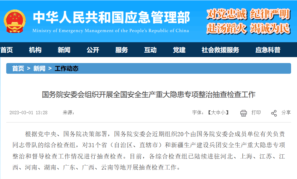 近日,從應(yīng)急管理部網(wǎng)站獲悉,根據(jù)黨中央、國務(wù)院決策部署,國務(wù)院安委會近期組織20個由國務(wù)院安委會成員單位有關(guān)負(fù)責(zé)同志帶隊的綜合檢查組,對31個省(自治區(qū)、直轄市)和新疆生產(chǎn)建設(shè)兵團(tuán)安全生產(chǎn)重大隱患專項整治和督導(dǎo)檢查工作情況進(jìn)行抽查檢查。目前,各綜合檢查組已陸續(xù)進(jìn)駐河北、上海、江蘇、江西、河南、湖南、廣東、廣西、云南等地開展抽查檢查工作。