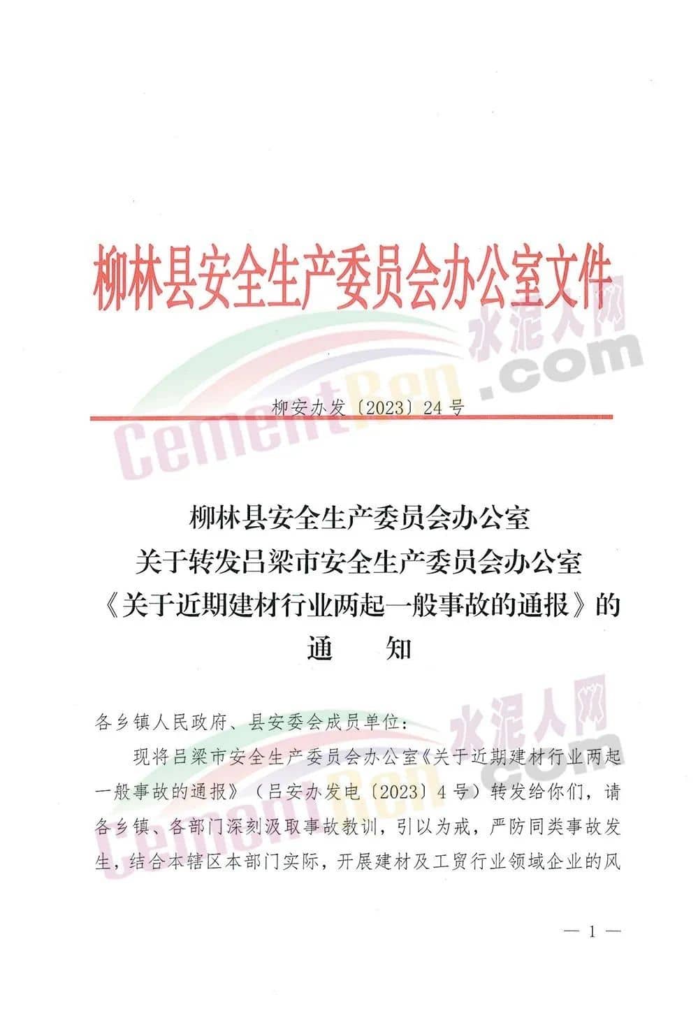呂梁市安全生產(chǎn)委員會辦公室于2023年3月22日發(fā)布的事故通報提到,責(zé)令呂梁山水水泥有限公司、中陽縣桃園水泥有限責(zé)任公司交口縣分公司即日起立即停止各項生產(chǎn)建設(shè)行為,積極配合事故調(diào)查。待事故調(diào)查結(jié)束后,由市、縣安全監(jiān)管部門聘請專家聯(lián)合驗收后,方可恢復(fù)檢維修作業(yè)。各水泥企業(yè)在復(fù)工復(fù)產(chǎn)(含檢維修作業(yè)),前要制定嚴(yán)密作業(yè)方案并報當(dāng)?shù)匕踩鞴懿块T審核同意后方可復(fù)工復(fù)產(chǎn)。