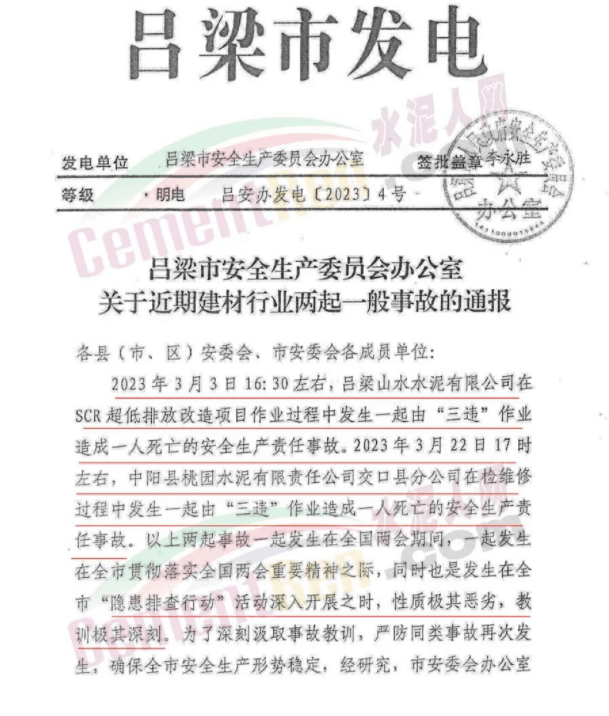 據(jù)呂梁市安全生產(chǎn)委員會辦公室通報:2023年3月3日16:30左右,呂梁山水水泥有限公司在SCR超低排放改造項目作業(yè)過程中發(fā)生一起由“三違”作業(yè)造成一人死亡的安全生產(chǎn)責(zé)任事故。