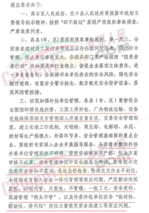 對鋼鐵、氧化鋁、電解鋁、水泥、耐材等生產(chǎn)規(guī)模大、外委環(huán)節(jié)多、安全管理基礎(chǔ)弱的重點企業(yè),要組織專家深入企業(yè)開展指導(dǎo)服務(wù),全面排查整治外協(xié)外委單位管理職責(zé)不明確、資質(zhì)資格審查不嚴(yán)格、作業(yè)方案審核不認(rèn)真,安全管理協(xié)議中安全措施不具體,安全技術(shù)交底或安全告知不落實,現(xiàn)場監(jiān)督檢查、協(xié)調(diào)交叉作業(yè)不到位未將相關(guān)方納入企業(yè)一體化管理等突出問題。