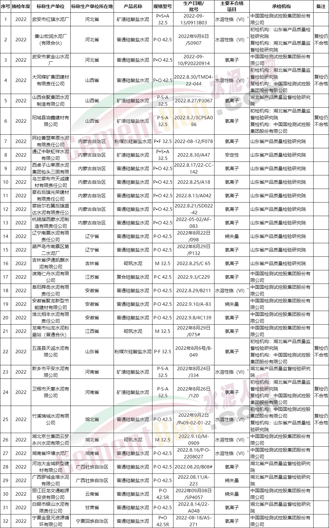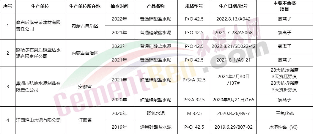 2020~2022年國抽水泥產(chǎn)品不合格名單