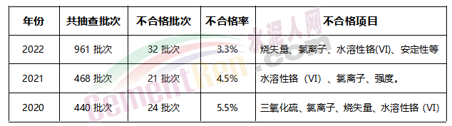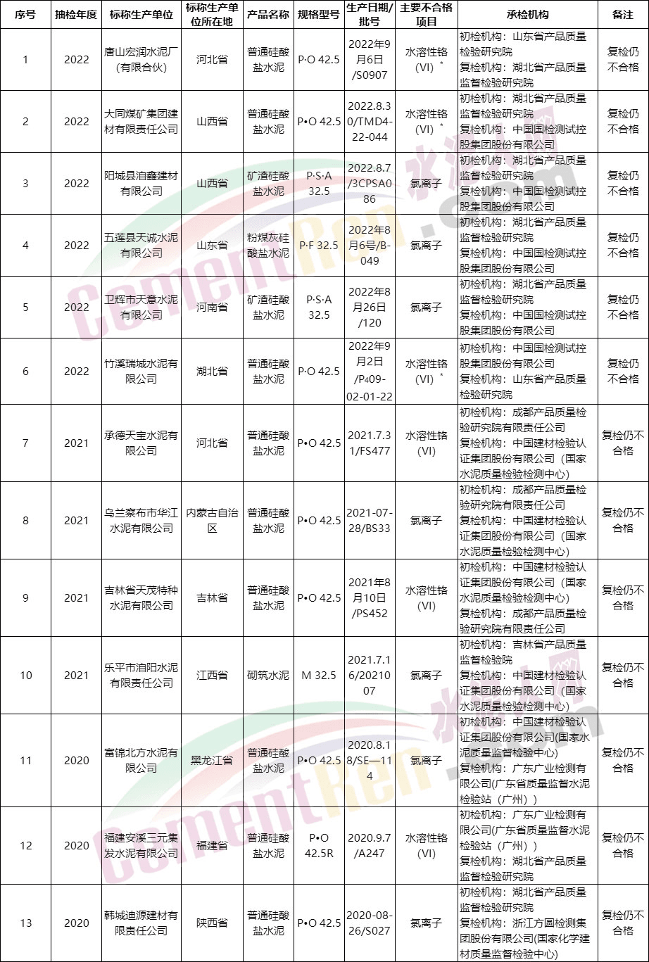 水泥人網(wǎng)注意到,2022年不合格產(chǎn)品較上年增加了11個(gè)批次,而且近三年國抽不合格項(xiàng)目中均包含氯離子、水溶性鉻(Ⅵ)。2020年~2022年國抽不合格名單中有13家企業(yè)復(fù)檢仍不合格。其中2022年國抽復(fù)檢仍不合格的企業(yè)共6個(gè)批次,2021年4個(gè)批次,2020年3個(gè)批次。
